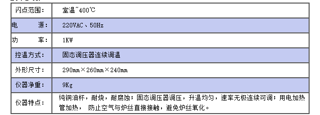 儀器符合GB/T3536;GB/T267;ASTMD92標準,適用于測定石油產品的閃點和燃點,但不適用于測定燃料油的開口閃點低于79℃石油產品。儀器采用固態調壓器,用調節旋鈕調節電爐電壓從而實現按標準要求的升溫速度。