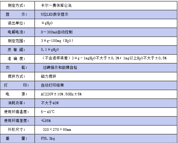 儀器符合GB/T7600;SH/T0246;GB/T606及采用卡爾—費(fèi)休法測定樣品中水分的有關(guān)標(biāo)準(zhǔn),儀器采用了先進(jìn)的自動控制電路,電解電流自動跟蹤控制,外型結(jié)構(gòu)新穎,從而使該儀器工作更可靠,使用更方便,具有分析速度快(一分鐘出結(jié)果)、操作簡便、精度高、自動性強(qiáng)等特點(diǎn),同時(shí)具有自動打印功能,可將實(shí)驗(yàn)結(jié)果、做樣時(shí)間、樣品編號自動打印出來,廣泛應(yīng)用于石油、化工、電力、鐵路、環(huán)保等部門。